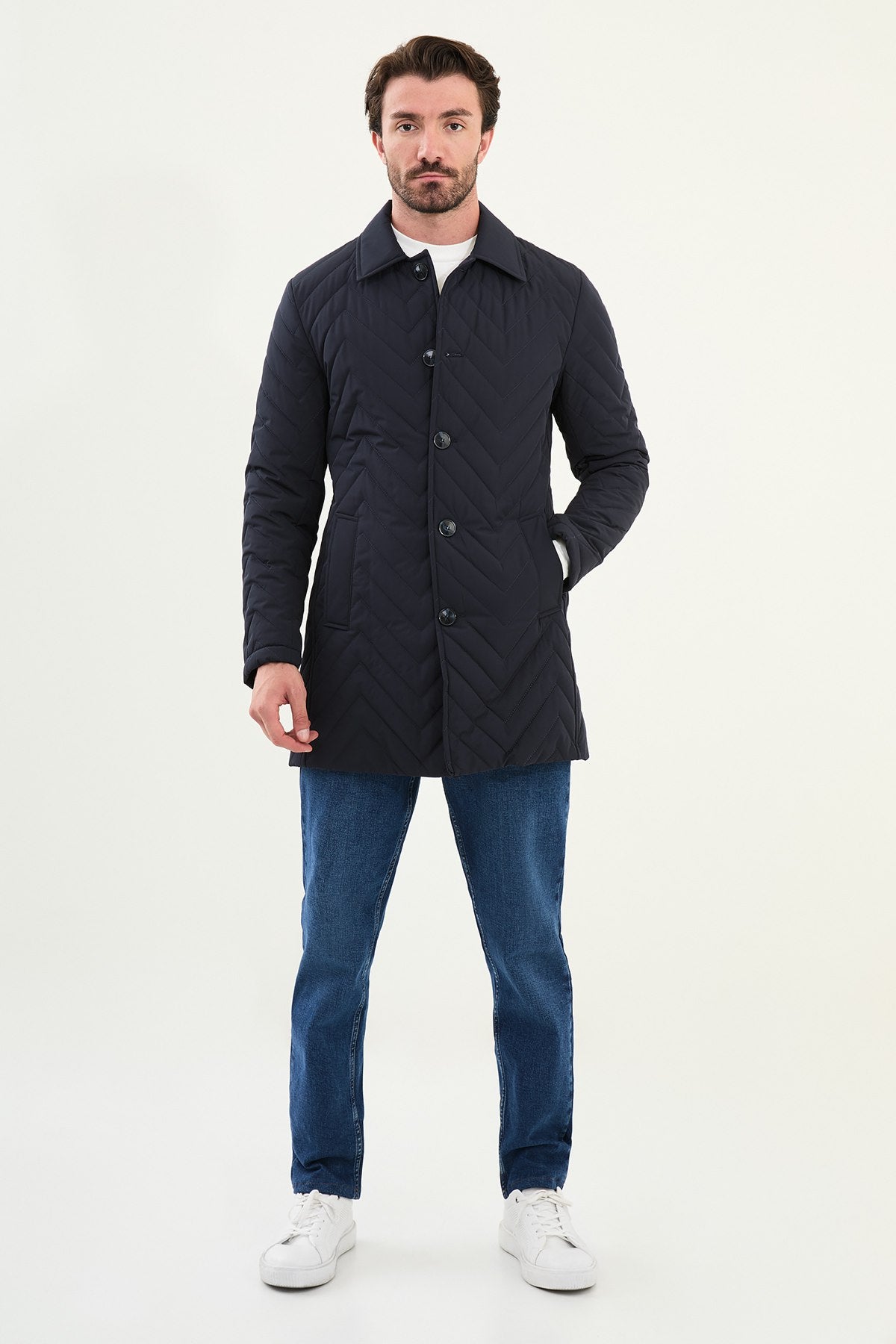 Chevron Quilted Button Jacket – Navy Blue